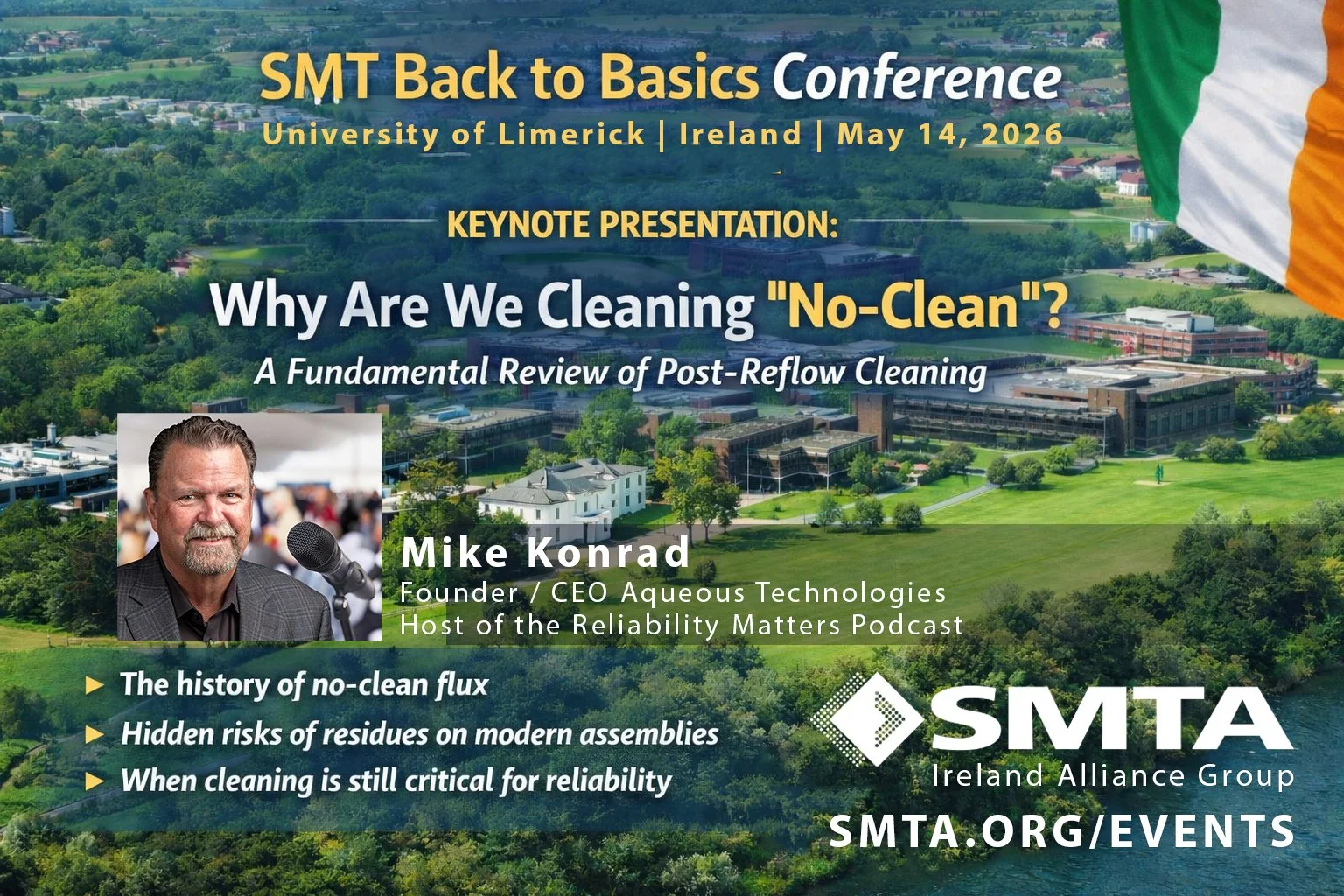 Mike Konrad, Founder / CEO of Aqueous Technologies will be the keynote speaker at the upcoming Surface Mount Technology Association - SMTA Ireland “Back to Basics” Conference, taking place Thursday, May 14 at the University of Limerick.